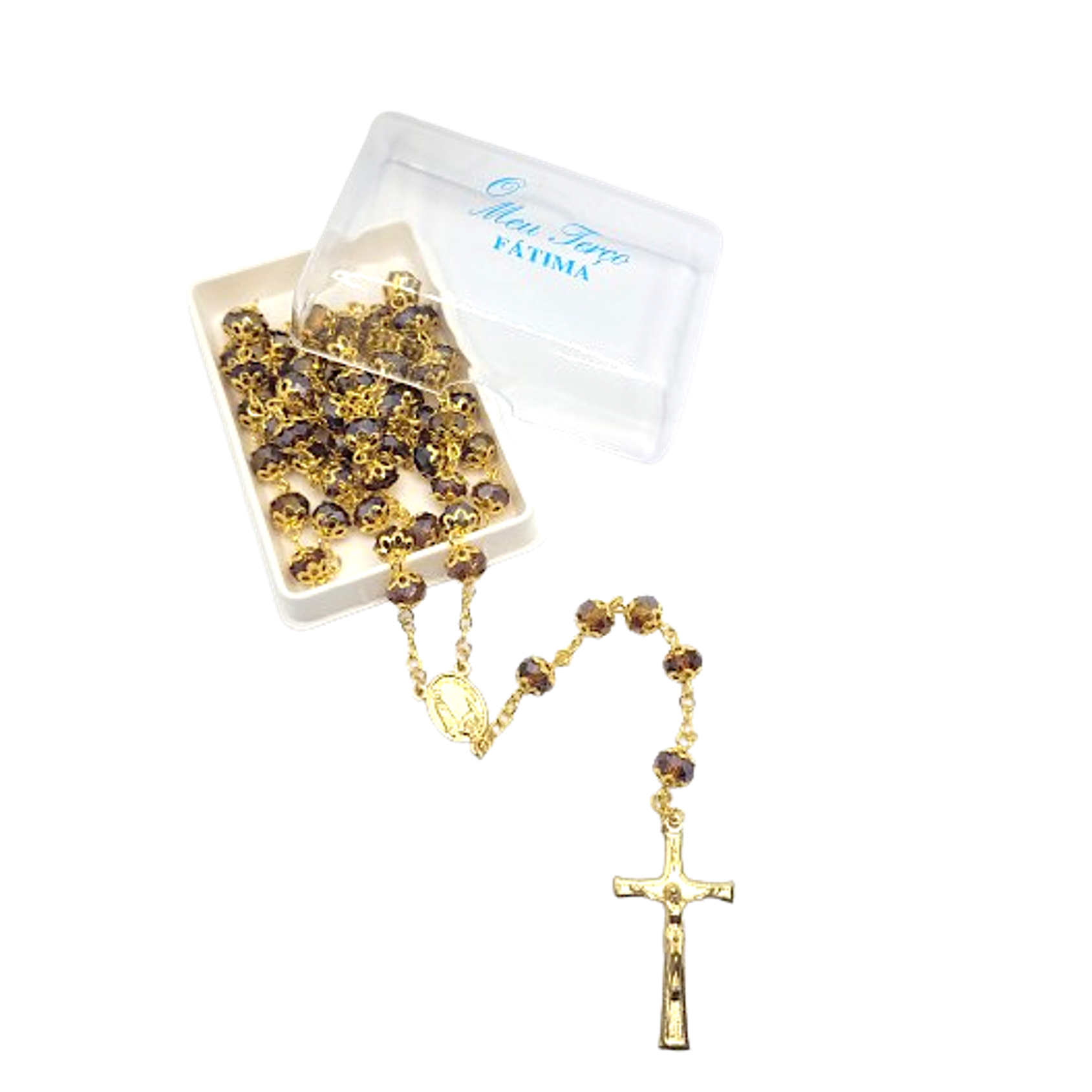 At the heart of this rosary lies a stunning golden cross, delicately engraved with the word "Fátima" on the reverse side. This radiant cross serves as a beacon of faith and devotion, guiding your prayers with its luminous presence.