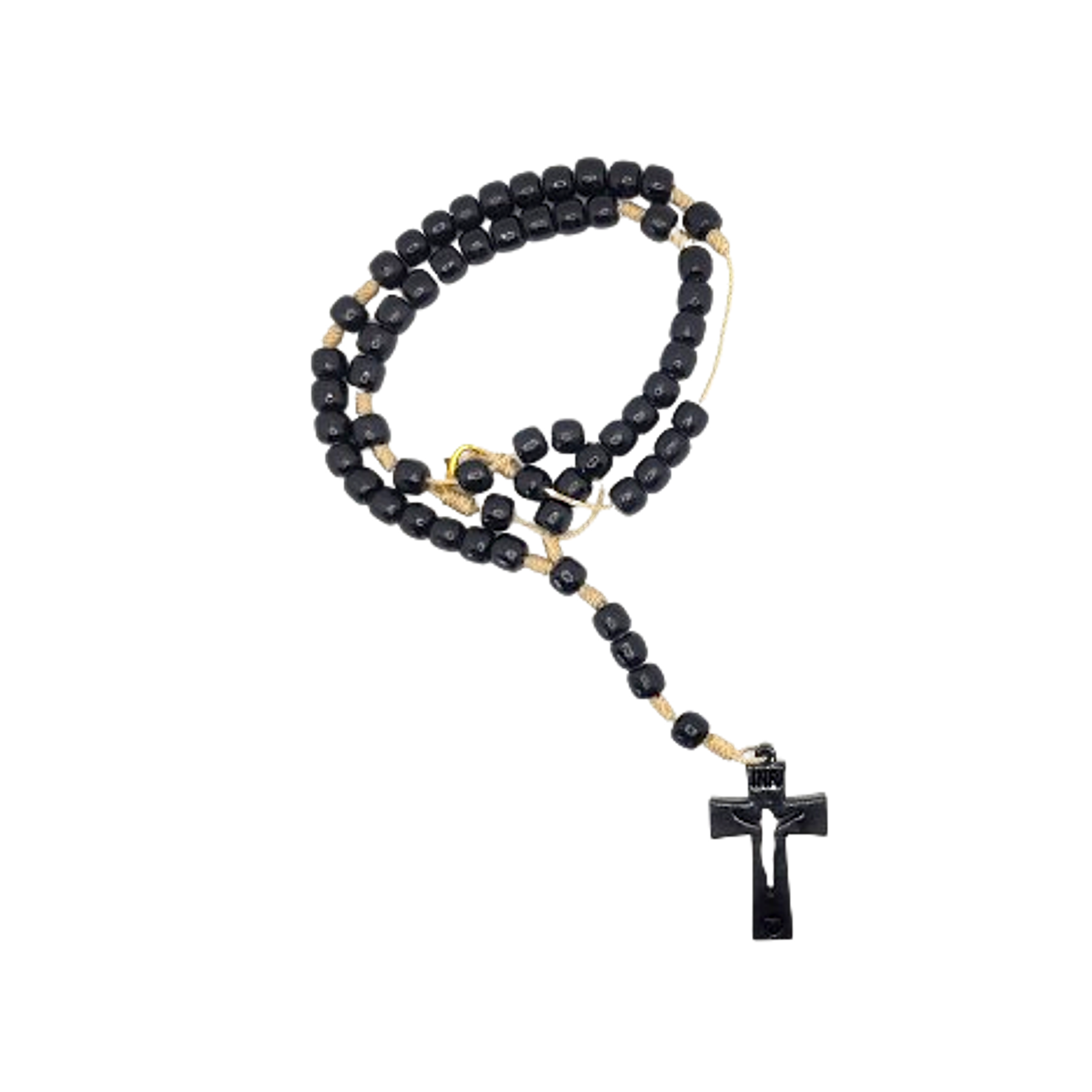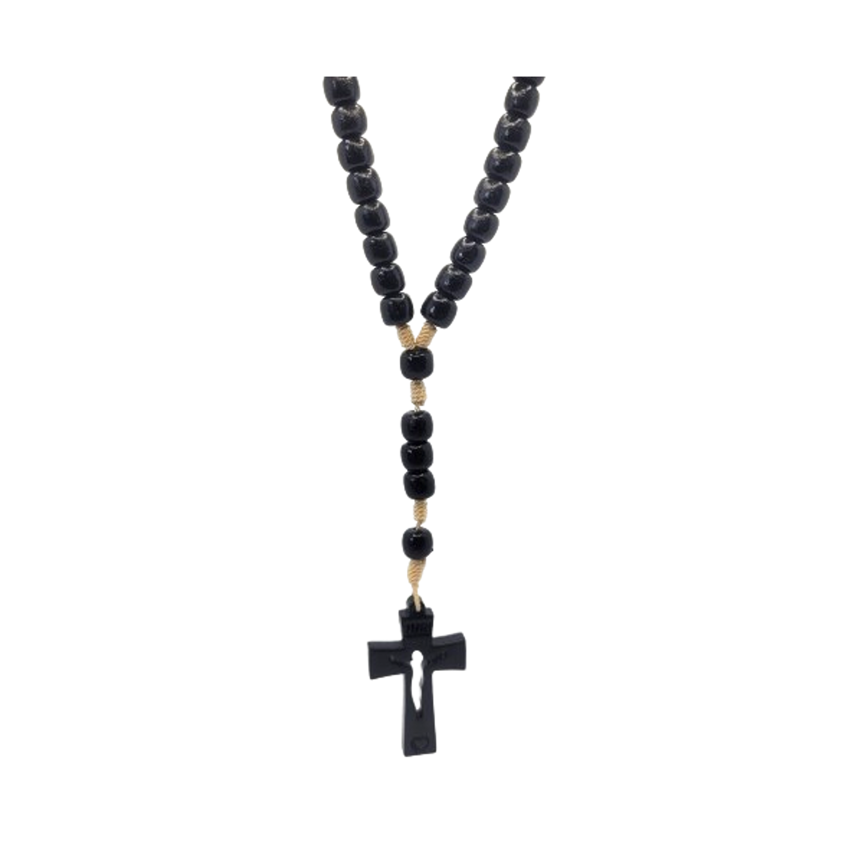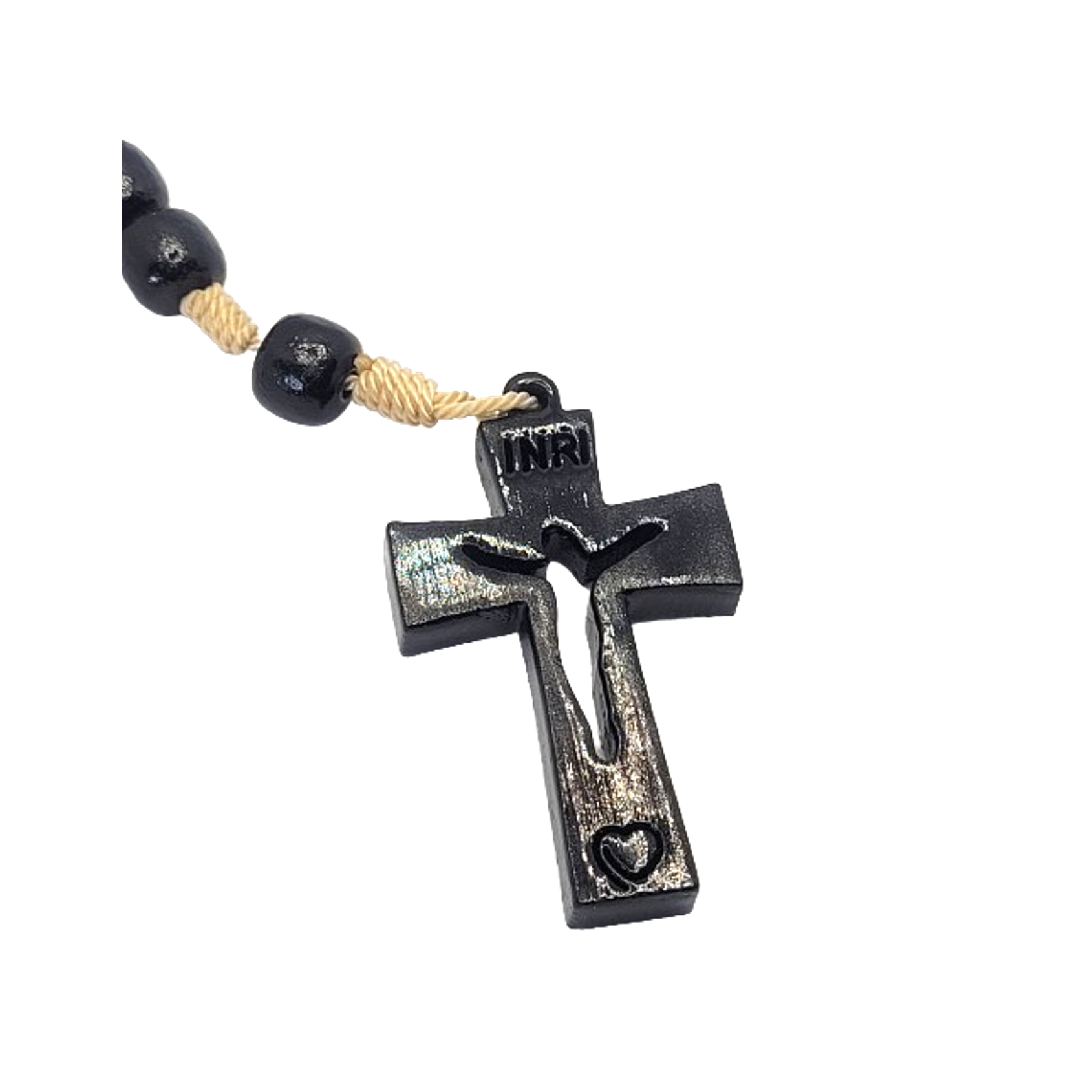 At the center of this rosary hangs a striking black wood cross, adorned with a small heart, symbolizing love and devotion.