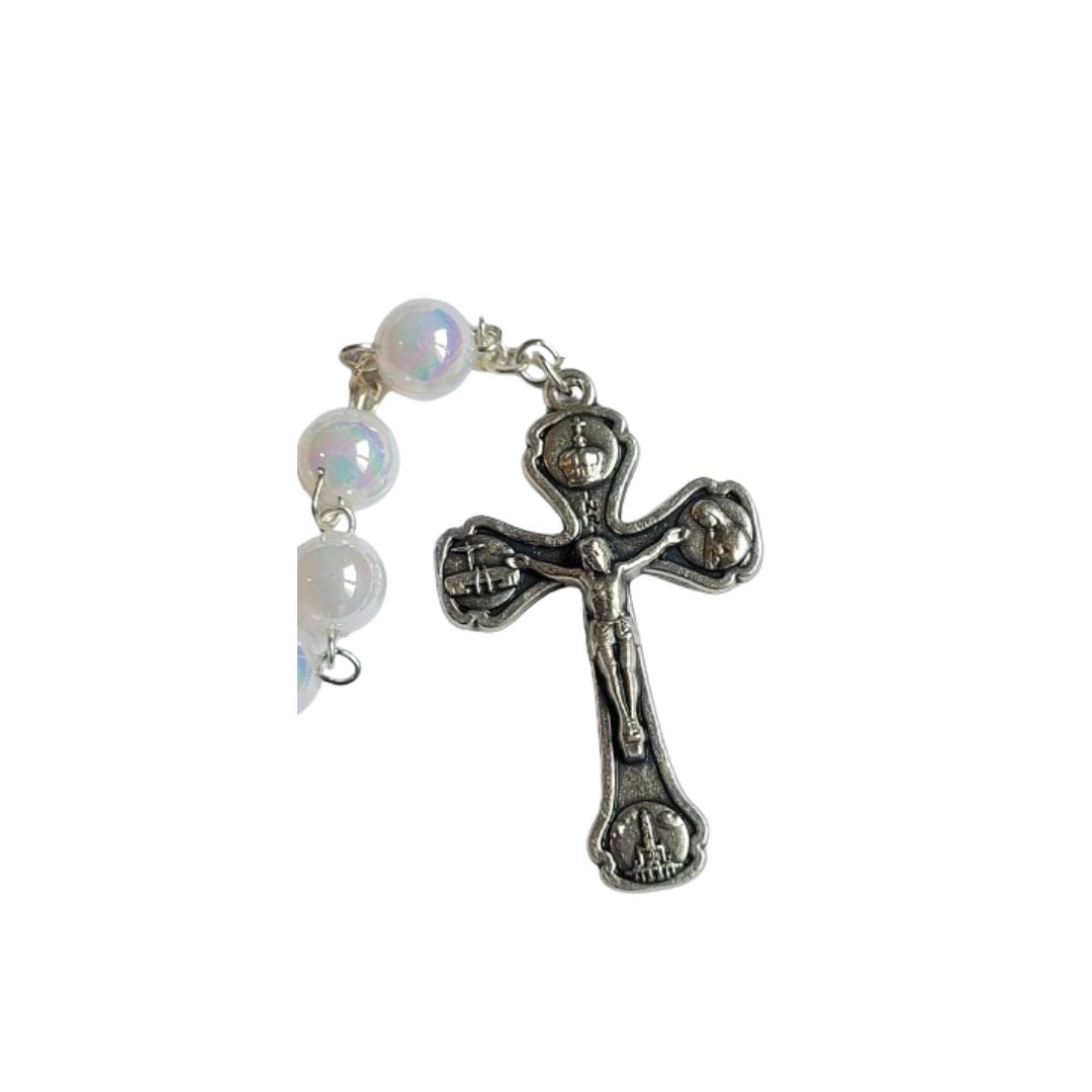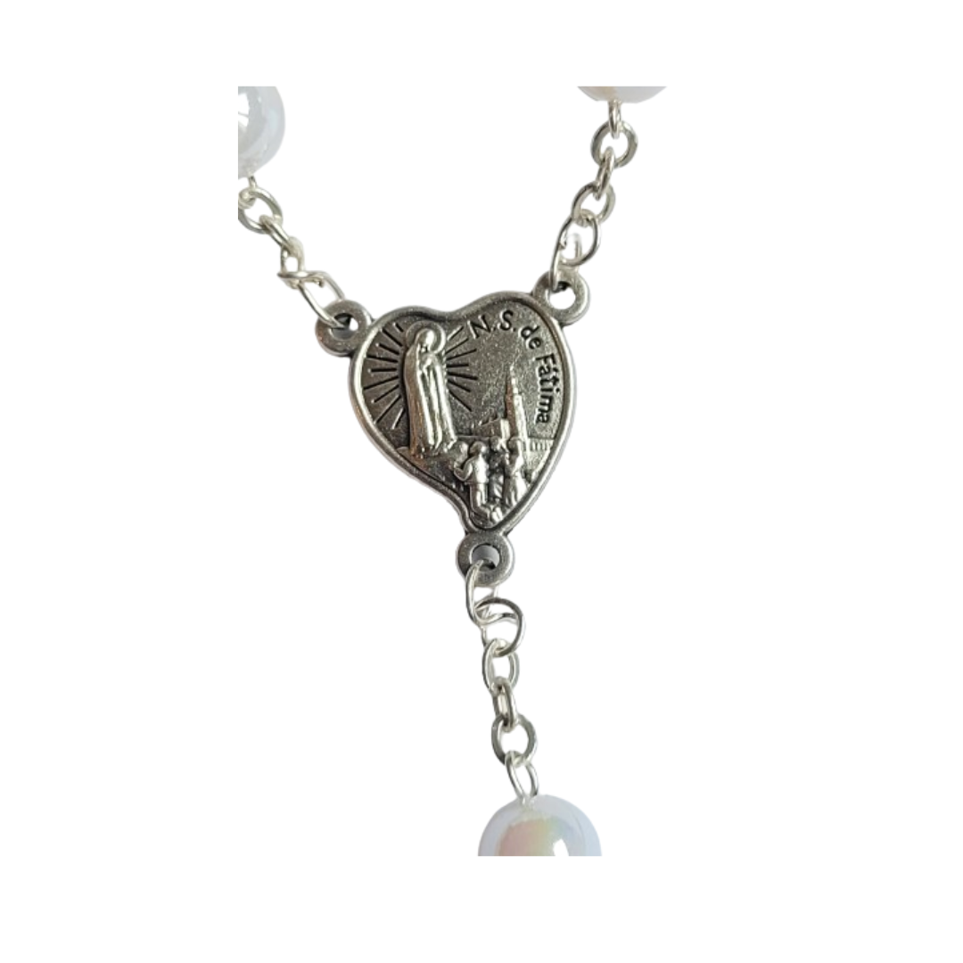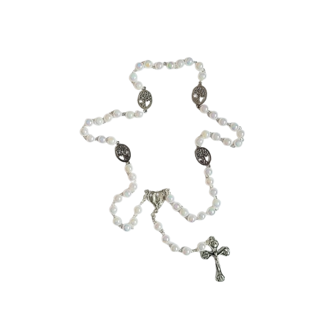 Las radiantes perlas blancas de este rosario fomentan una sensación de pureza y gracia.
