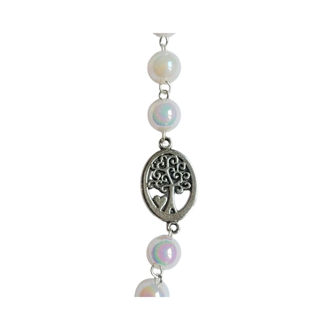 Delicadas medallas plateadas del Árbol de la Vida adornan este rosario y simbolizan el crecimiento, la fuerza y la interconexión espiritual.