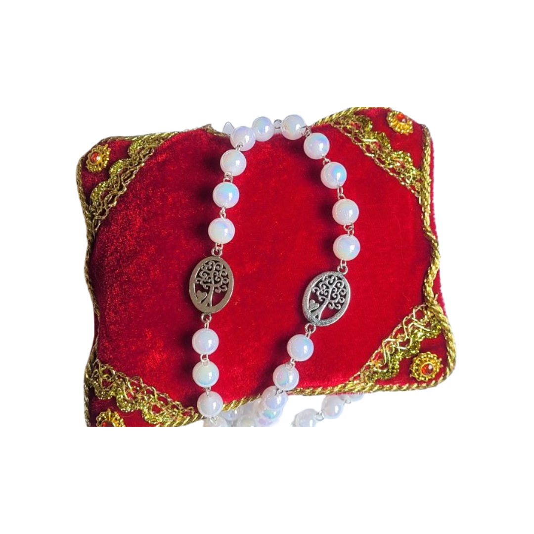 Haga su pedido ahora para experimentar la belleza clásica de las perlas, el diseño simbólico del Árbol de la Vida, el toque moderno de la cruz dorada y las imágenes sagradas de la Virgen María y los símbolos de Fátima.