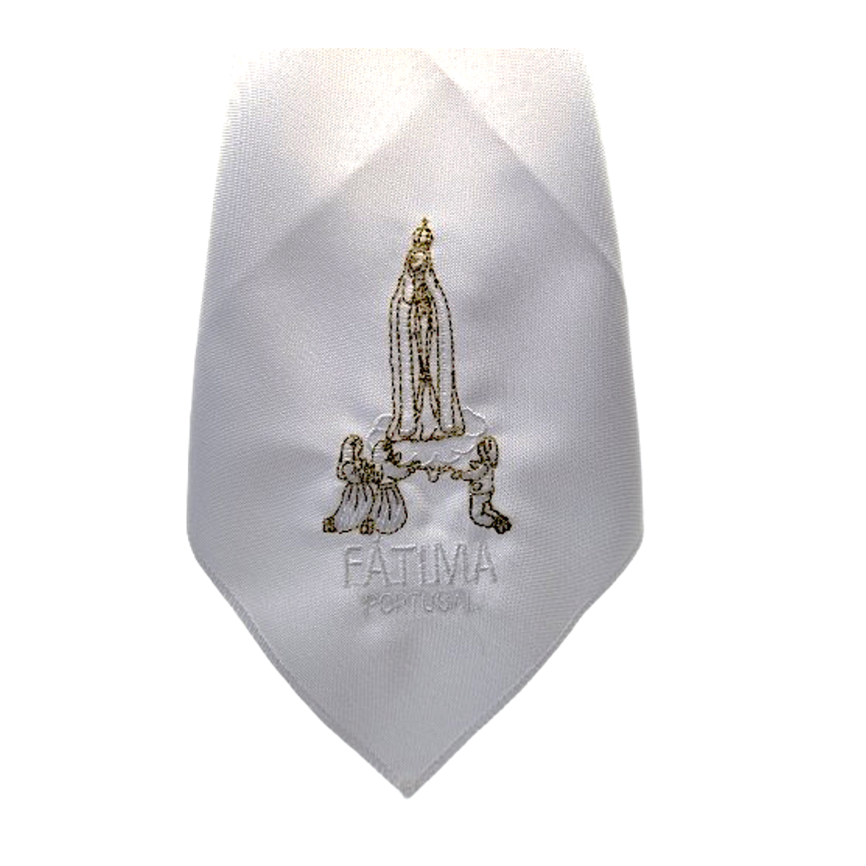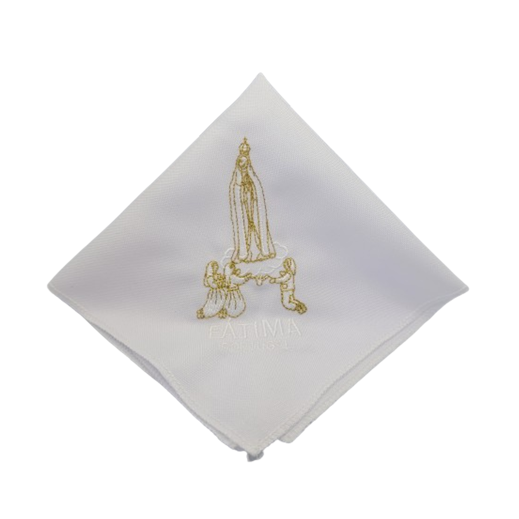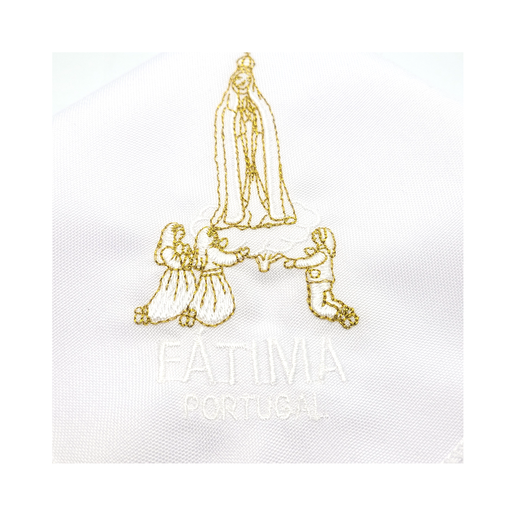 Adorning this scarf are delicate golden embroideries depicting the sacred Apparitions of Fatima. Each detail captures the divine presence and blessings bestowed upon the faithful at this sacred place.