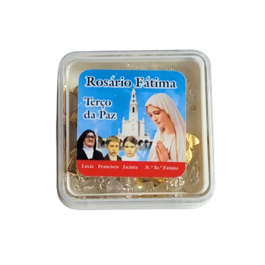 🌟 Un accesorio de oración luminoso y delicadamente elaborado que personifica la elegancia. Este pequeño rosario, meticulosamente hecho a mano con cuentas de cristal , presenta una medalla dorada adornada con las apariciones de Nuestra Señora de Fátima en un lado y el Sagrado Corazón de Jesús en el otro. Está bellamente presentado en una caja adornada con la imagen de Nuestra Señora de Fátima, los tres pastorcitos y una paloma de la paz, creando un preciado símbolo de fe y tranquilidad.
