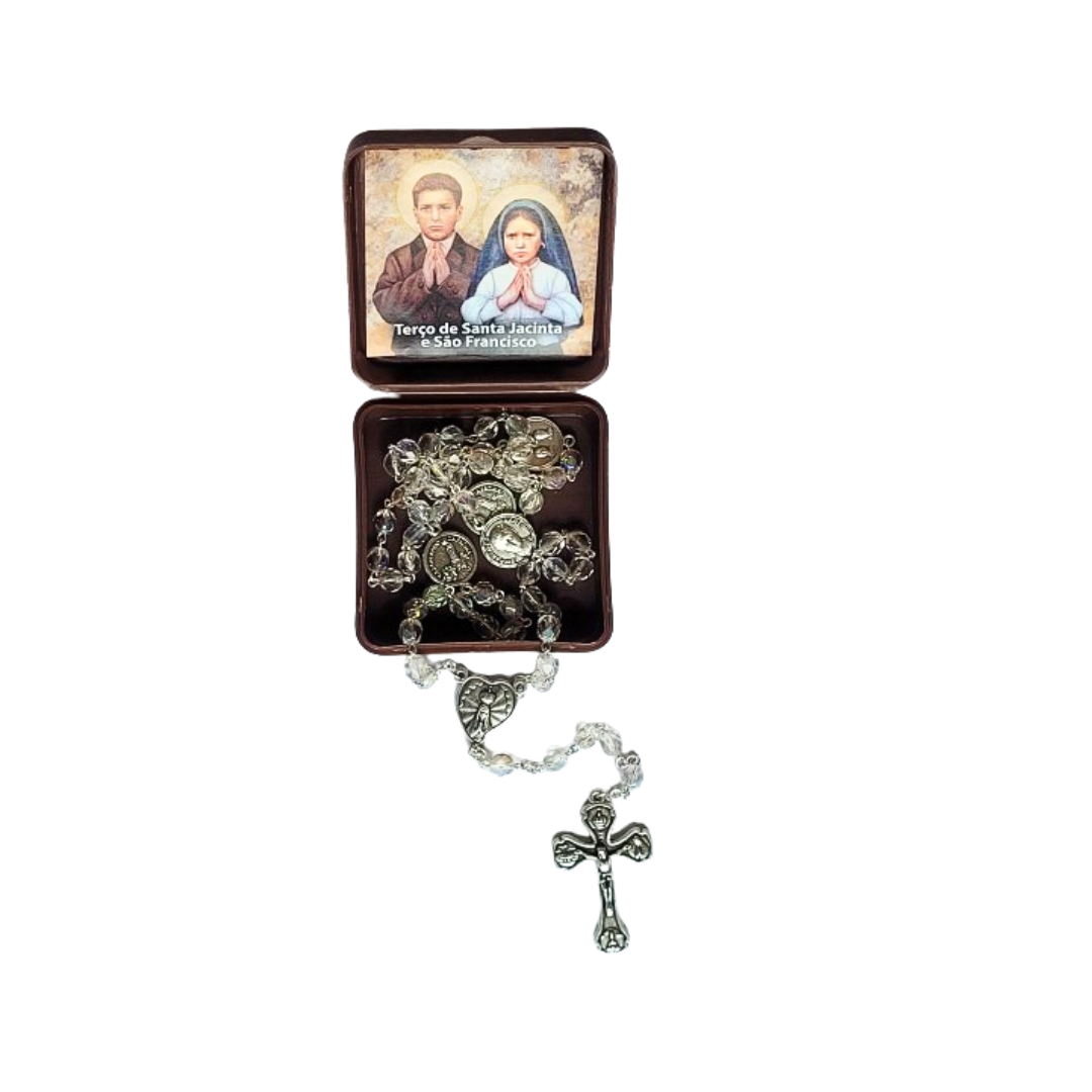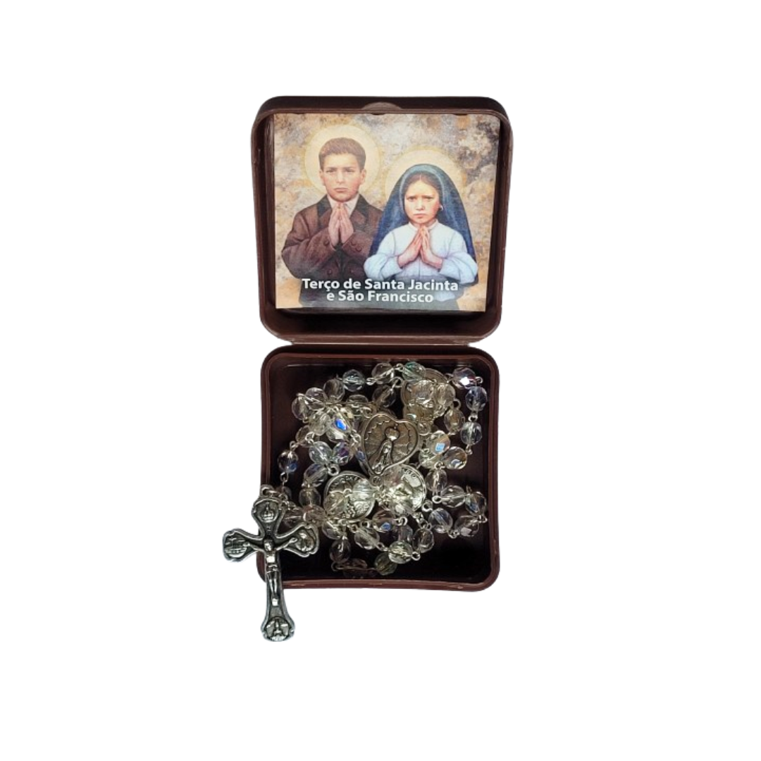 Nuestro Rosario Cristal Tres Pastorcitos de Fátima viene en una elegante caja adornada con la imagen de las apariciones. El interior de la caja presenta una tierna imagen de Jacinta y Francisco Marto, creando un fondo significativo para su preciado rosario.