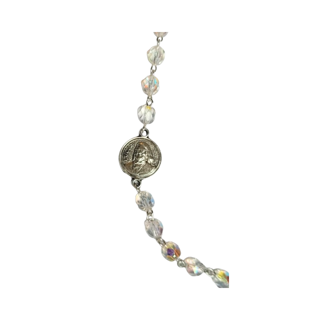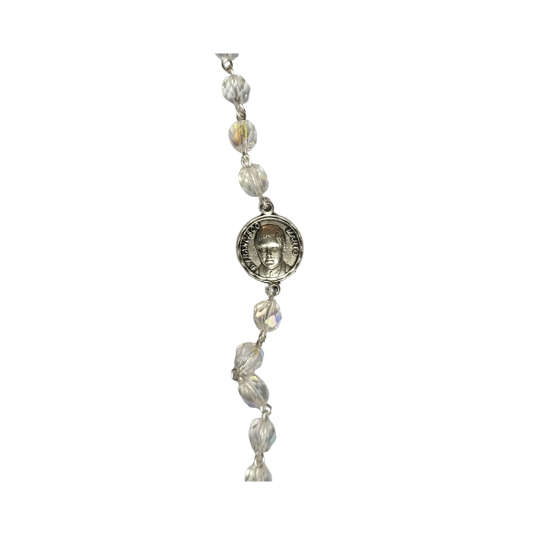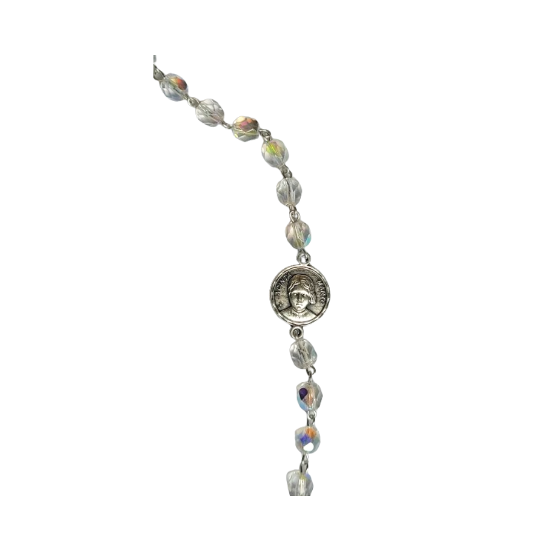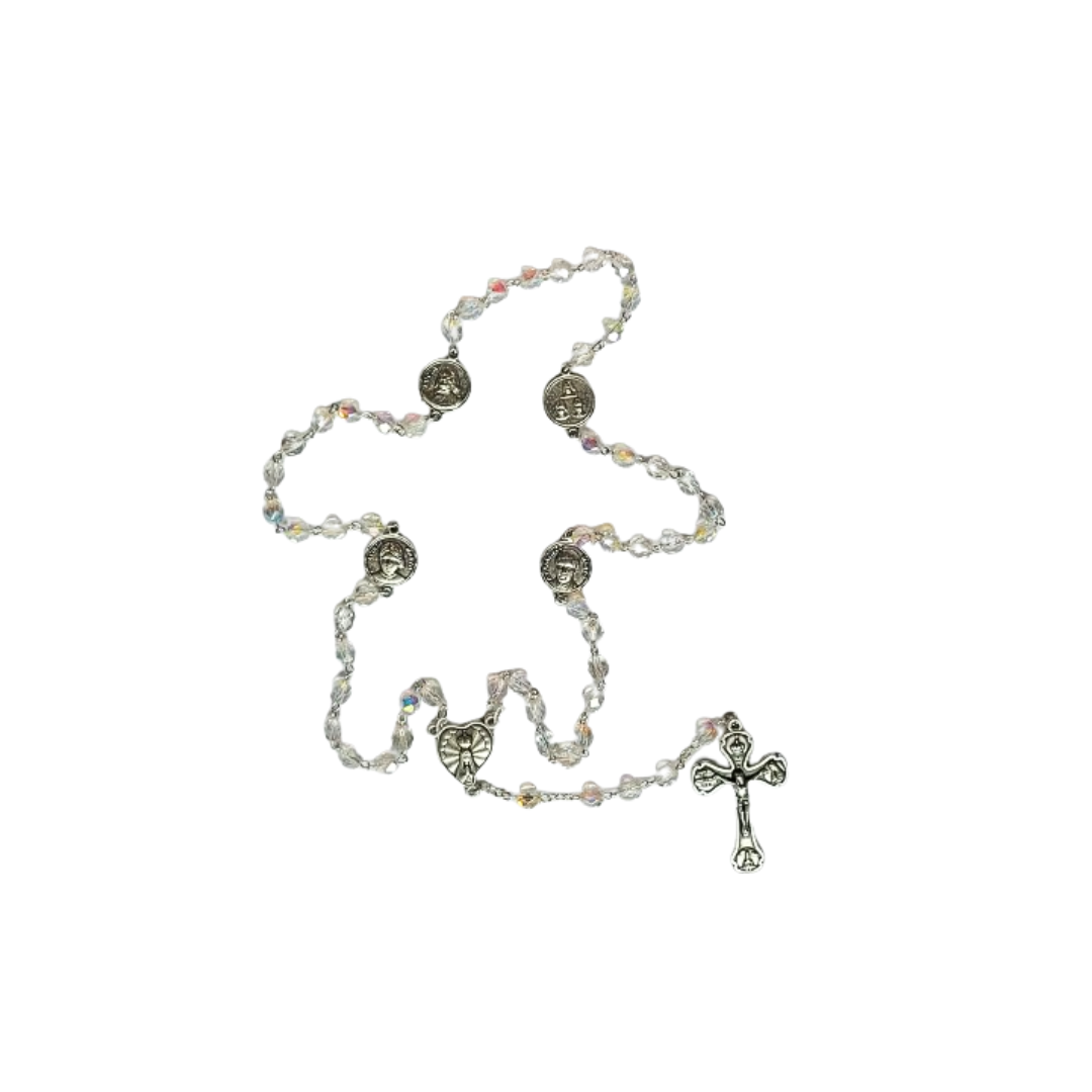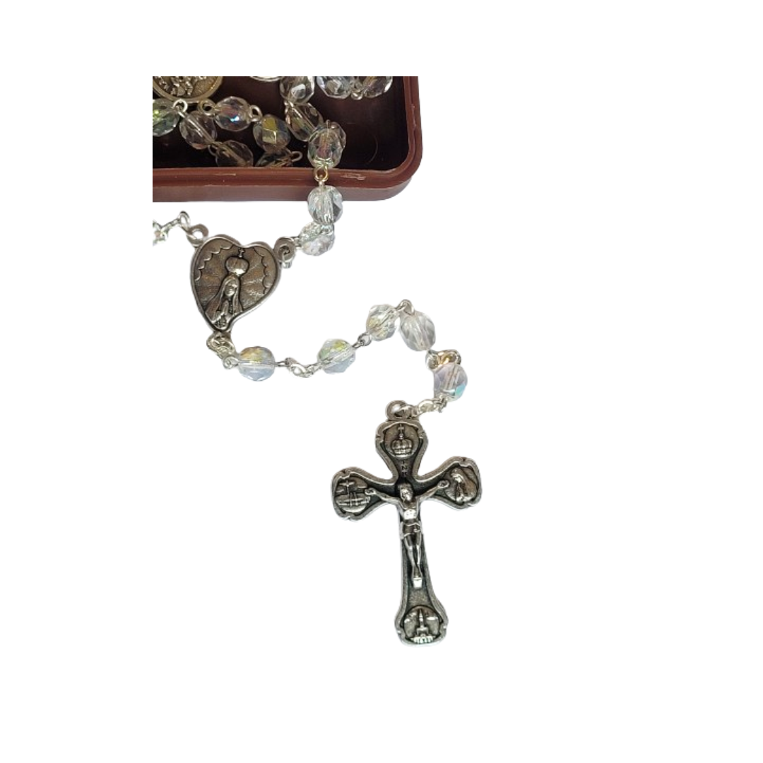 Una radiante expresión de fe y devoción adornada con símbolos de Fátima y la inocencia de los tres pastorcitos. Meticulosamente elaborado con cuentas de cristal, este exquisito rosario presenta medallas de plata que conmemoran a los pastorcitos , una medalla en forma de corazón que representa las apariciones por un lado y Nuestra Señora de Fátima por el otro, y una cruz adornada con los símbolos de Fátima. El reverso de la cruz muestra los tres pastorcitos y la corona de María .