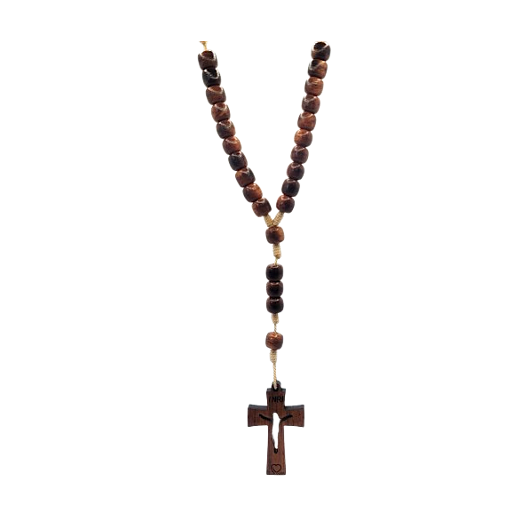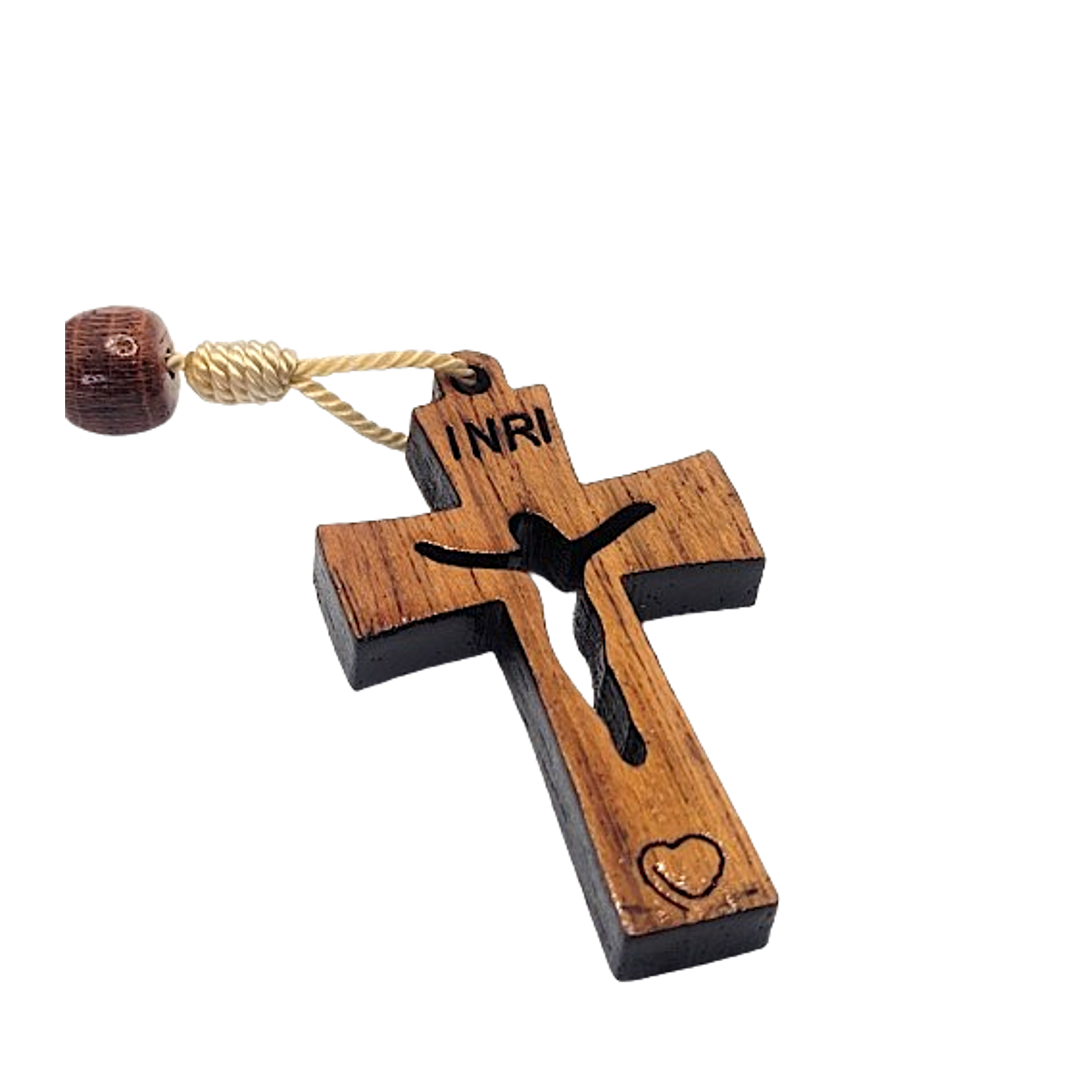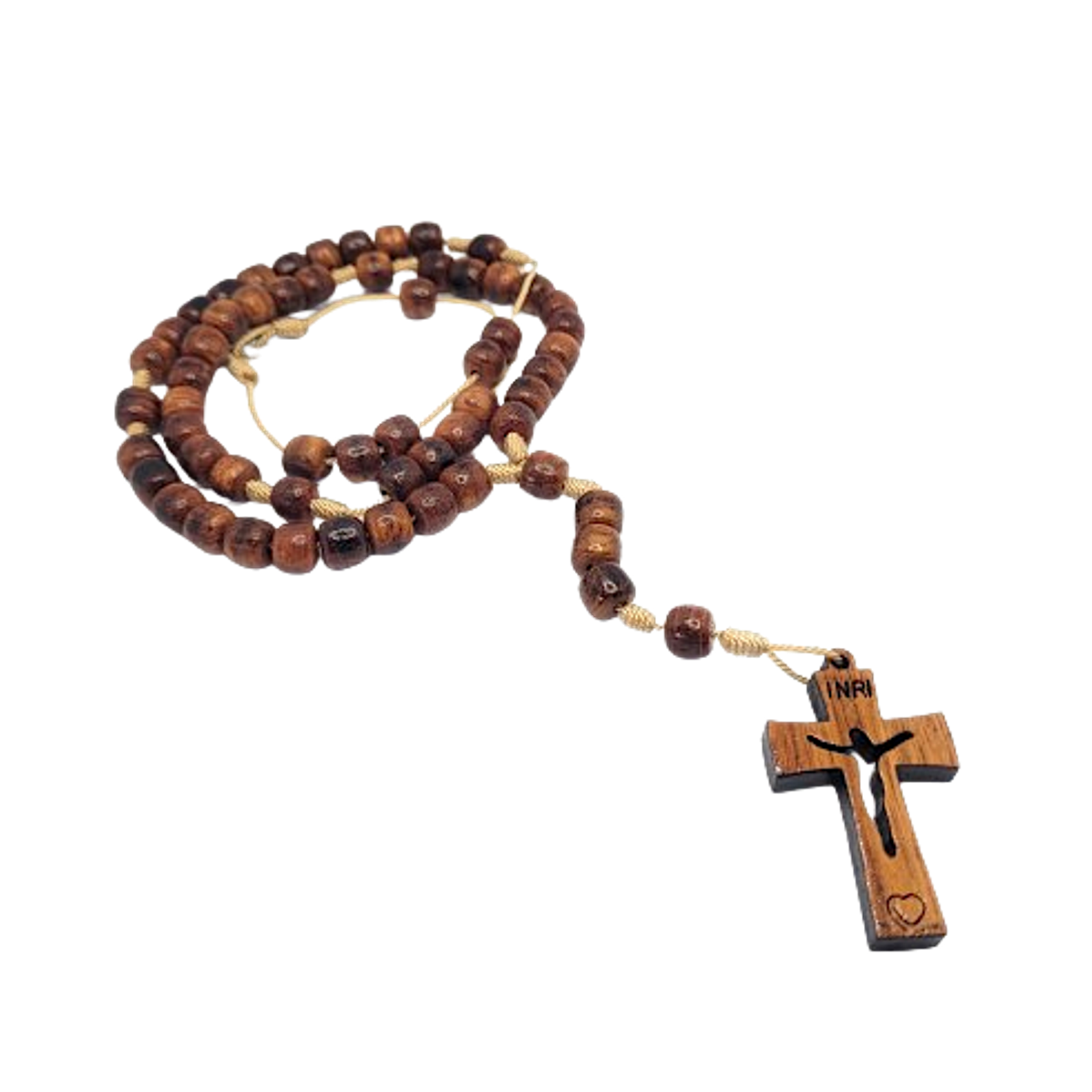 At the center of this rosary hangs a striking wood cross, adorned with a small heart, symbolizing love and devotion.